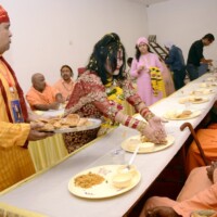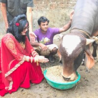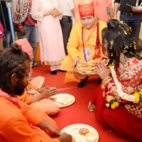Her seva to God includes encouraging her devotees to donate blood, clothes, food, books, and medicines to sadhus, old age homes, religious scholars, cow shelters, and orphanages.